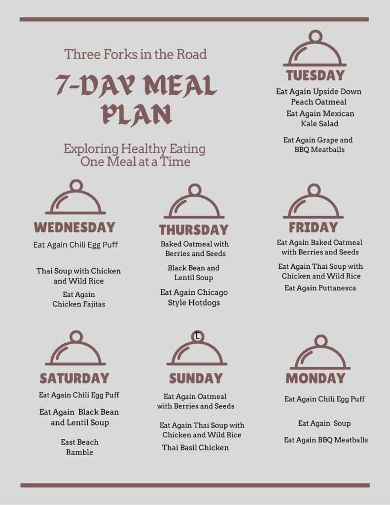 Tuesday Eat Again Oatmeal, Berries and Seeds, Eat Again Thai Soup with Chicken and Wild Rice, Beef and Veggie Bowl * New Recipe as follows…