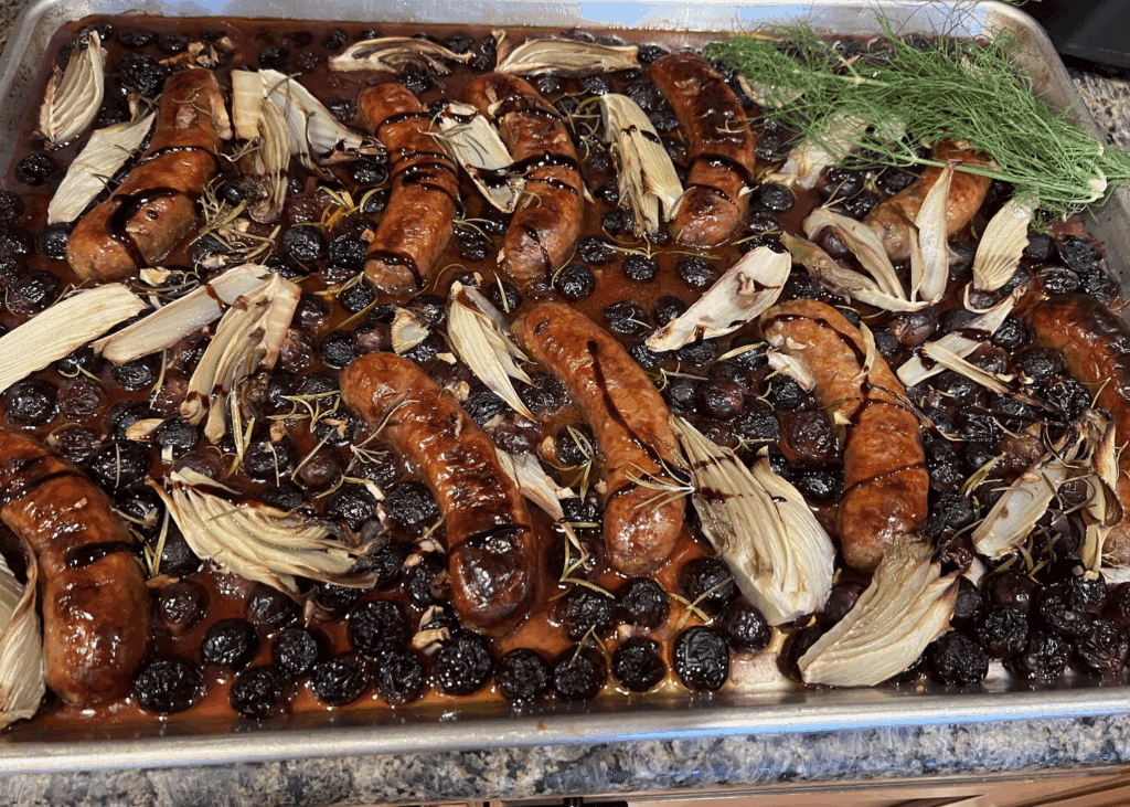 As our daughter in law packed up to take the final load to Tennessee I promised dinner. In a discussion weeks ago I realized that everyone in the family had enjoyed Rachael’s recipe for Sausages and Grapes except her. I fixed it for our “last supper.” I think this time it was one of the best I have made. It was perfection!