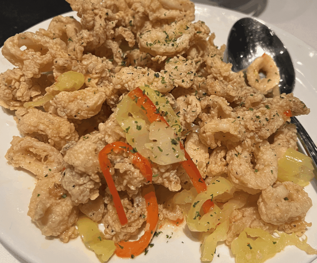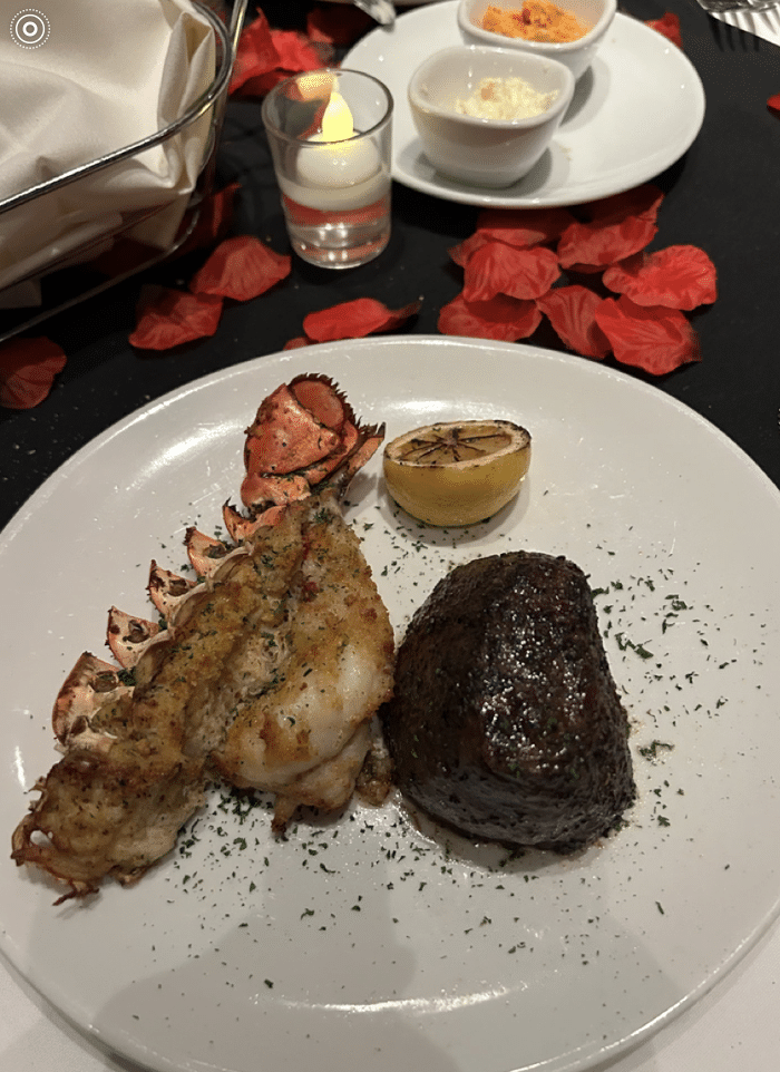 We love Flemings and have had many wonderful celebratory meals there. The closest one to us currently is in Richmond, so we spent a night there and then traveled to Williamsburg. On our anniversary eve the ‘Ole Buckeye enjoyed a salad and the filet/crab stuffed lobster and I had calamari, one of my favorites. I couldn’t waste a chance to enjoy it again so it was my entree. Notice the rose petals on the table and the sparkler with dessert.